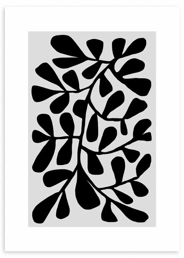 Gerahmtes Wandbild mit botanischer Komposition aus schwarzen Blättern in organischen Formen auf weißem Hintergrund, umgesetzt in einer abstrakten Bildsprache mit starkem Kontrast. Das Design überzeugt durch eine klare Silhouette und einen ausgewogenen visuellen Rhythmus, ideal für eine ruhige und stilvolle Raumwirkung. Es passt sehr gut in moderne Wohnzimmer, skandinavische Essbereiche oder Arbeitsräume mit eleganter und zeitgemäßer Wandgestaltung.