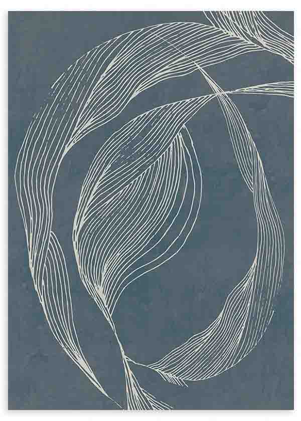 Abstraktes Gemälde mit Wellenlinien, die auf dunkelblauem Hintergrund zu tanzen scheinen. Die weichen weißen Linien erzeugen ein Gefühl von fließender Bewegung und Eleganz. Vermittelt Ruhe und Dynamik. Ideal für moderne und minimalistische Räume, lässt es sich perfekt mit neutralen Tönen und Dekorationen in Blau oder Grau kombinieren.