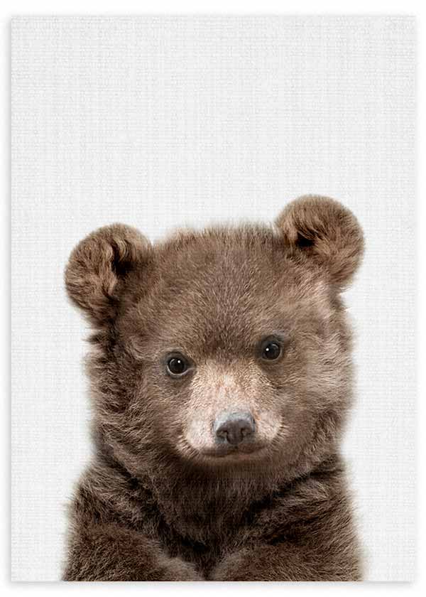Cuadro infantil con osito marrón de perfil sobre fondo blanco, kudeko.com