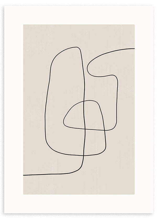 Wandbild mit abstrakter Komposition aus einer durchgehenden schwarzen Linie auf hellbeigem Hintergrund, gestaltet mit organischen Strichen und weiten Kurven, die eine ausgewogene und ruhige Form schaffen. Die minimalistische Ästhetik und die neutrale Farbpalette verleihen dem Motiv eine leichte Wirkung, ideal für ein modernes Wohnzimmer, ein entspanntes Schlafzimmer oder ein Arbeitszimmer mit Möbeln aus Holz, Naturfasern und Sandtönen.
