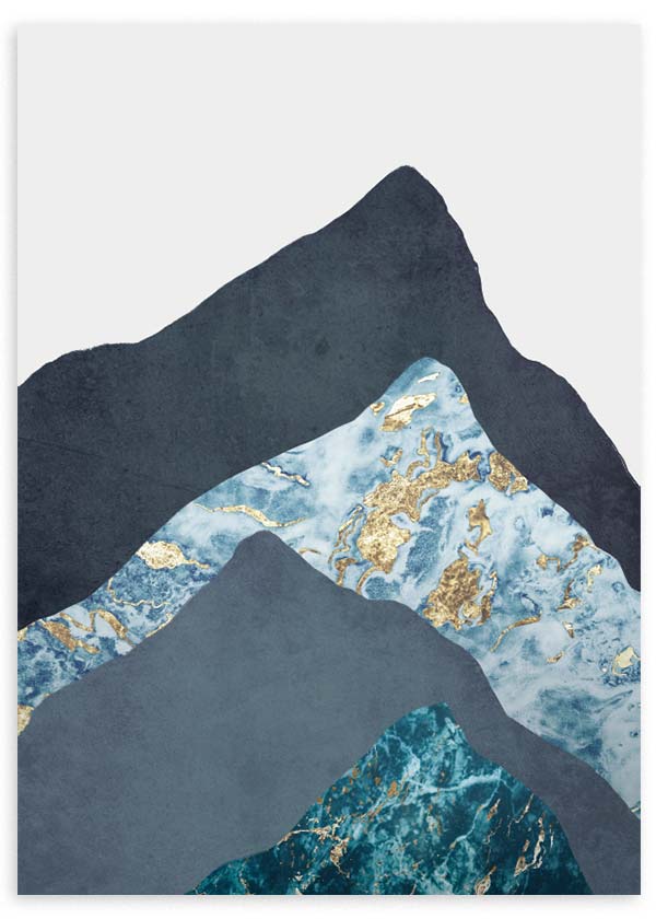 Peinture de montagnes dans les tons bleus et verts. Remplissez vos murs de textures incroyables avec ce tableau. La combinaison noir et or est la meilleure, non ? Décorez votre maison et remplissez-la d'art. Pour voir plus d'œuvres de ce style, rendez-vous sur notre collection de peintures abstraites .