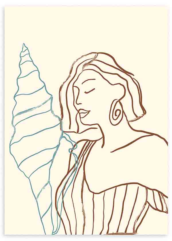 Peinture d'illustration artistique de femme et de conque en dessin. Une œuvre dans les tons crème, marron et bleu. Choisissez le cadre qui vous plaît le plus et accrochez-le directement sur vos murs. Vous trouverez également notre collection de peintures d'illustration en kudeko de ce style décoratif.