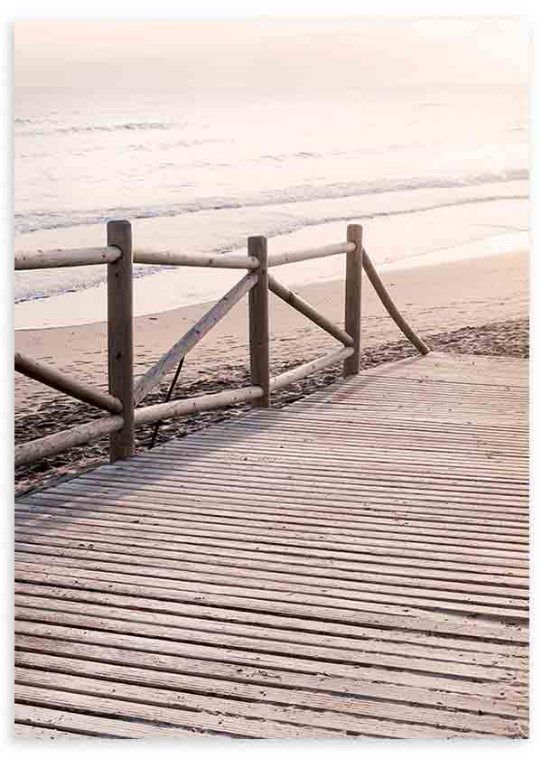 Peinture photographique d'un chemin ou d'une passerelle en bois sur la plage. Une œuvre très estivale. Choisissez la taille et le cadrage qui conviennent le mieux à vos murs. Si vous aimez ce style, vous pouvez également visiter notre collection de peintures photographiques ou de peintures de paysages et de nature .