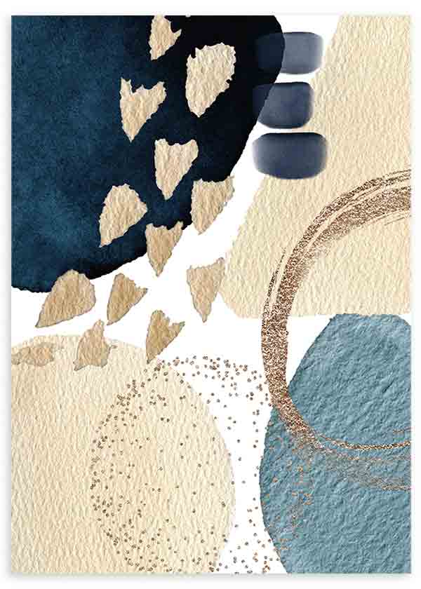 Tableau abstrait avec composition de formes organiques en bleu pétrole, beige sable, blanc et bleu gris, accompagnée de détails circulaires dorés. Son design équilibré et contemporain apporte de la profondeur visuelle sans alourdir l’espace. Il s’intègre parfaitement dans un salon moderne, une chambre apaisante ou un espace de travail à la décoration élégante et lumineuse.