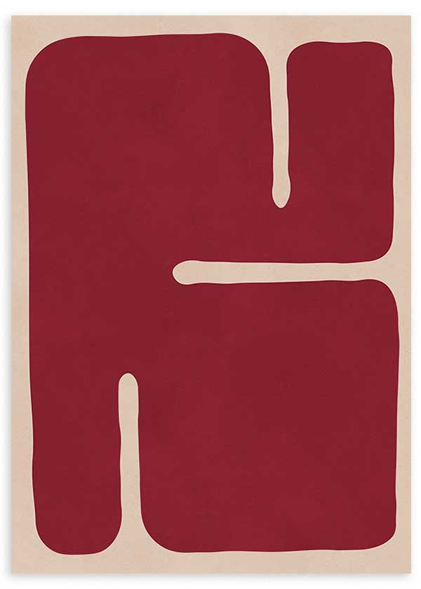 Tableau géométrique représentant une figure organique aux tons bordeaux sur fond beige. Son design fluide et contemporain crée une impression d'équilibre visuel et de chaleur. Il exprime sérénité et modernité en un seul geste. Idéal pour les intérieurs minimalistes ou de style Japandi, il s'harmonise parfaitement avec le bois naturel, les tons neutres et les éléments décoratifs en terre cuite ou sable.