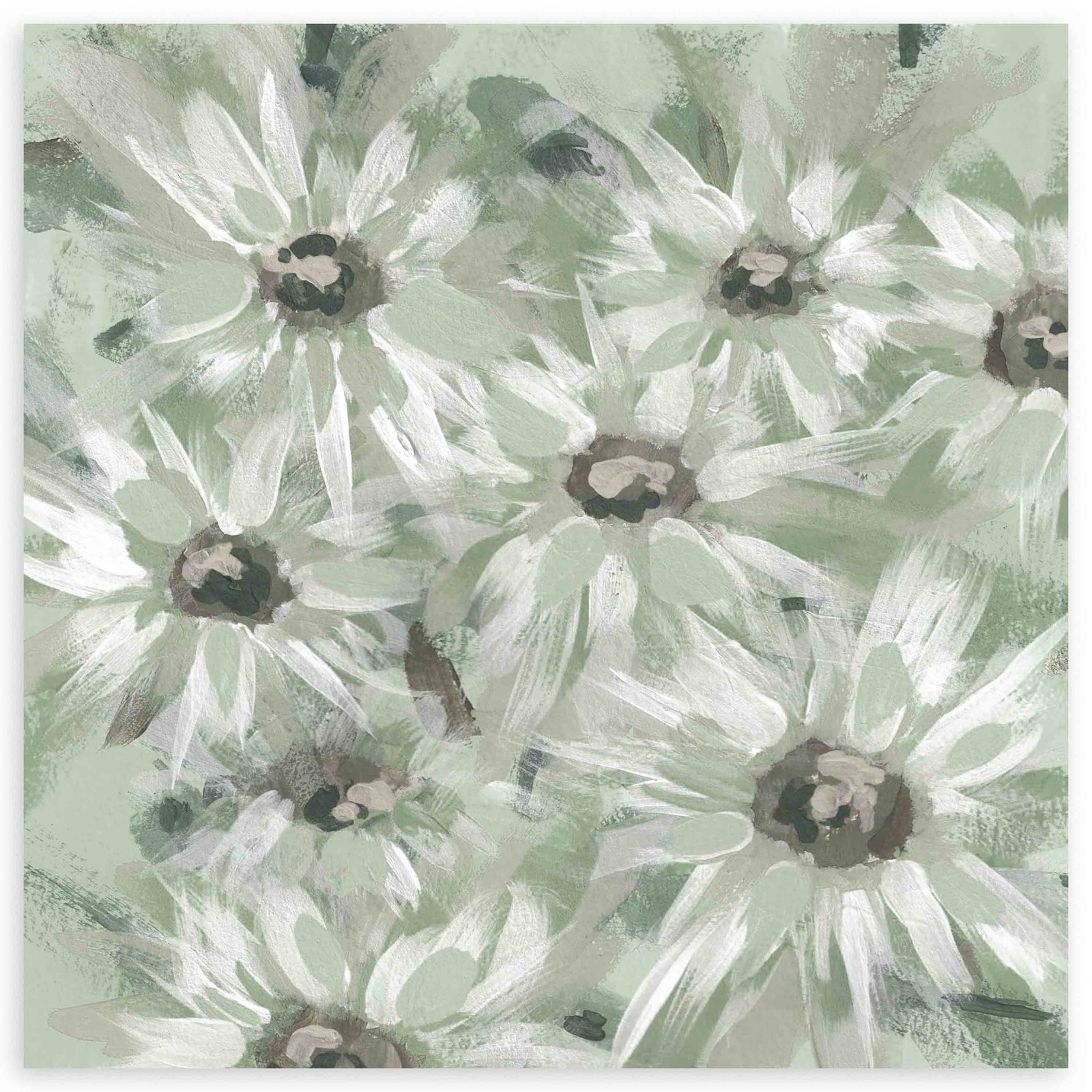 Tableau carré avec grandes marguerites blanches sur fond vert olive doux et gris clair, avec cœurs foncés et composition enveloppante. Son esthétique florale apporte une présence sereine et lumineuse, idéale pour décorer une chambre, un salon chaleureux ou une entrée de style naturel dans une atmosphère fraîche et apaisante.