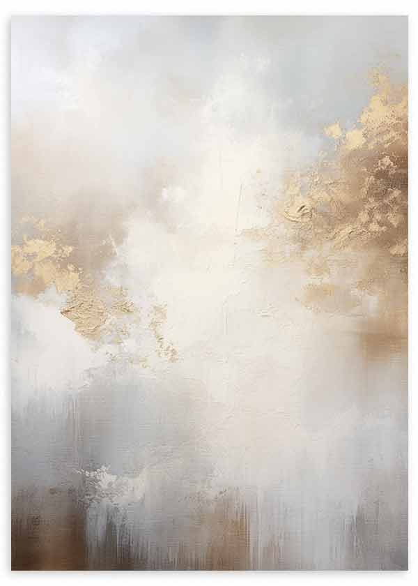 Tableau abstrait avec une composition éthérée de taches diffuses et de textures dans des tons blanc, beige, gris perle et touches dorées. Le mélange de formes douces et de zones plus texturées crée une image lumineuse et soignée. Son style abstrait apporte calme et élégance, idéal pour un salon contemporain, une chambre soignée ou des espaces à l’esthétique neutre avec des accents chaleureux.