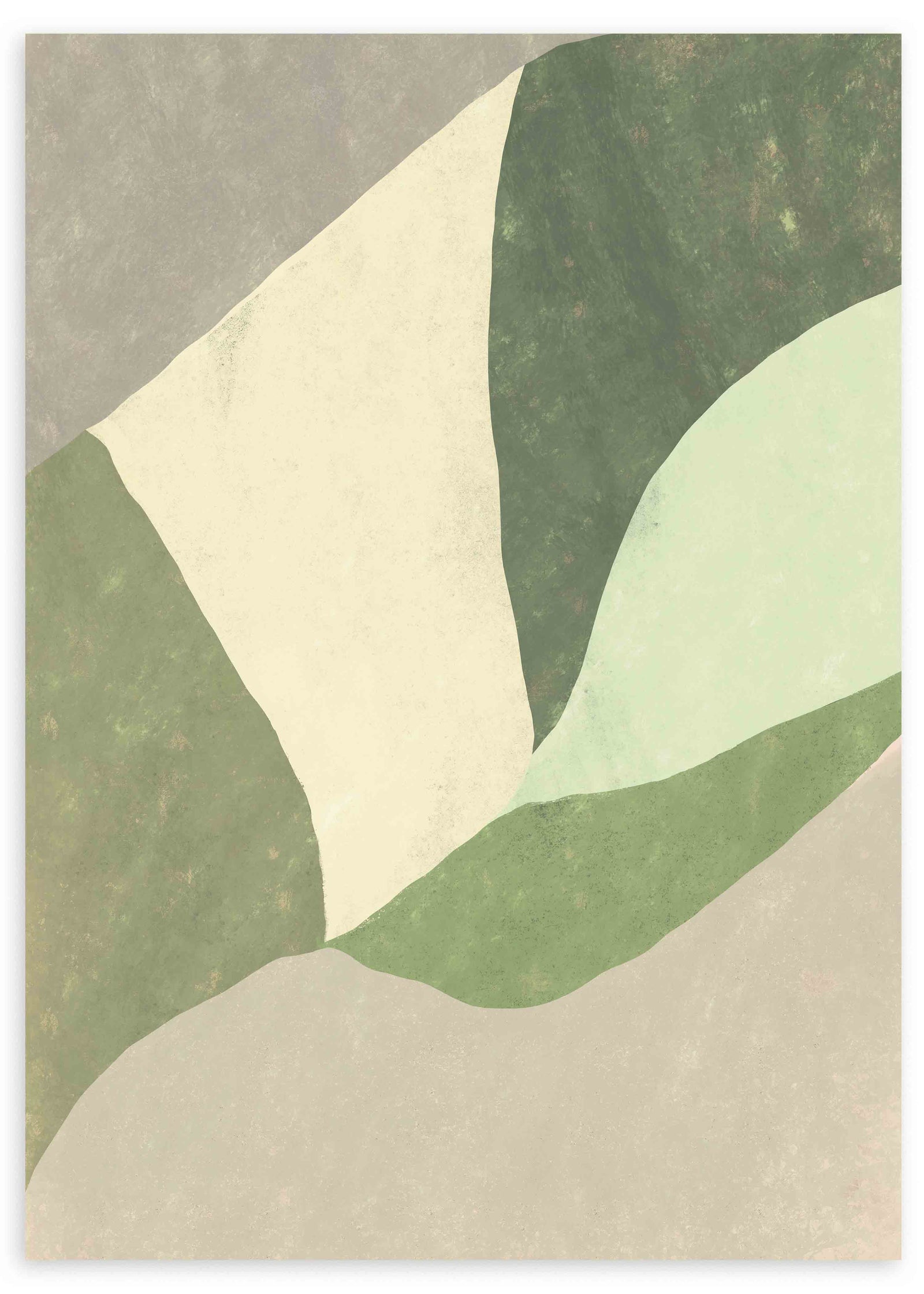 Tableau avec formes géométriques superposées en vert sauge, vert foncé, beige et ivoire, texture douce et style géométrique apaisant pour intérieur contemporain. Disponible sur kudeko.com
