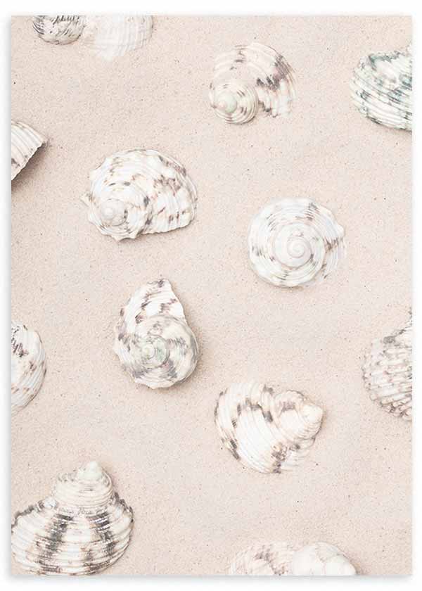 Peinture photographique de coquillages et de conques sur la plage. Une œuvre très estivale. Choisissez la taille et le cadrage qui conviennent le mieux à vos murs. Vous pouvez trouver d'autres œuvres en rapport avec cela dans notre collection de peintures photographiques ou de peintures de paysages et de nature .