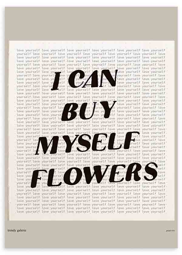 Photo avec la phrase "Je peux m'acheter des fleurs" , un clin d'œil à la chanson de Miley Cyrus. Un tableau de style nordique qui s'intègre très bien dans les environnements neutres et lumineux. Choisissez l'un de nos cadres faits à la main pour l'accrocher à son arrivée à la maison. Vous pouvez trouver plus d'œuvres en rapport avec cela dans notre collection de peintures avec des phrases ou de peintures nordiques .