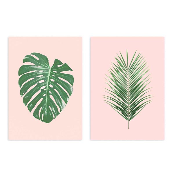 decoración con cuadros, ideas - conjunto de cuadros de ilustraciones florales sobre fondo rosa, hojas verdes - kudeko
