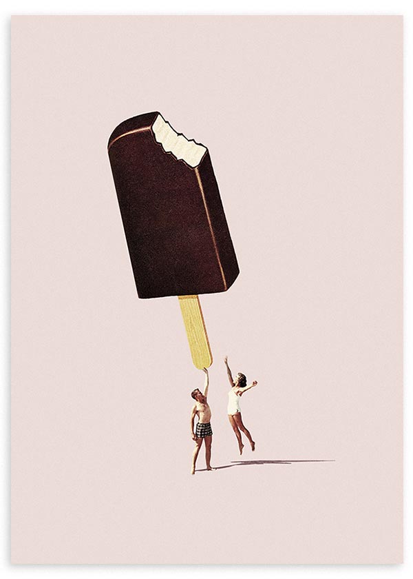 Tableau encadré avec une grande glace au chocolat croquée, suspendue au-dessus de deux minuscules silhouettes humaines sur un fond rose très doux. Les tons brun foncé, beige et rosé composent une scène épurée et inattendue au style surréaliste, dans l’univers de l’illustration. Il apporte une note originale et décontractée aux salons modernes, chambres créatives ou espaces jeunesse à l’esthétique contemporaine.