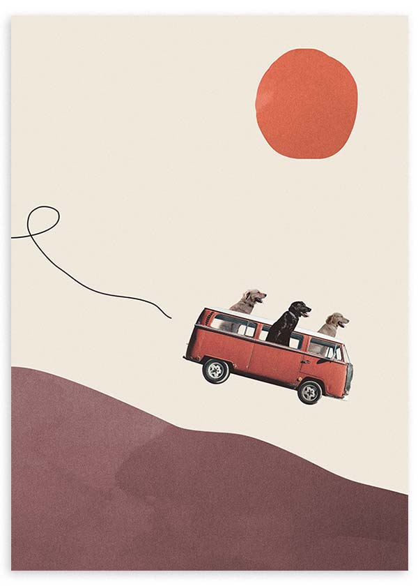 Cuadro con una furgoneta roja en movimiento, tres perros asomados por las ventanas, un sol terracota y colinas en tonos malva sobre fondo crema. Su composición sencilla y lúdica, de estilo infantil, aporta calidez y una sensación aventurera. Encaja muy bien en dormitorios infantiles, cuartos de juego o rincones decorativos con paletas suaves y modernas.