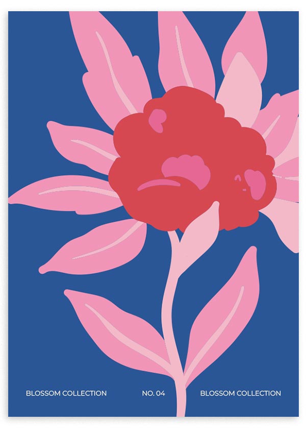 Cuadro con una gran flor de formas simplificadas sobre fondo azul intenso, con pétalos y hojas en rosa y centro en rojo coral. La composición de alto contraste y estilo floral aporta un acento alegre y contemporáneo. Encaja muy bien en salones modernos, dormitorios juveniles o rincones creativos donde se busque sumar color, frescura visual y una presencia decorativa llamativa.