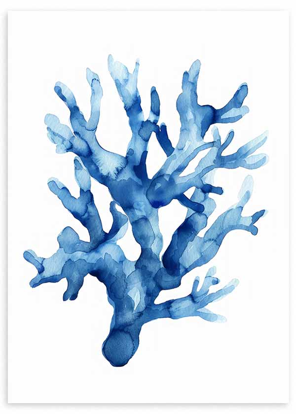 Cuadro con una figura de coral marino en tonos azules y celestes sobre fondo blanco, con una composición limpia y ligera que resalta su silueta orgánica. De estilo ilustración, aporta frescura visual y una atmósfera serena. Encaja muy bien en salones costeros, dormitorios luminosos o baños decorados con inspiración mediterránea y detalles naturales.