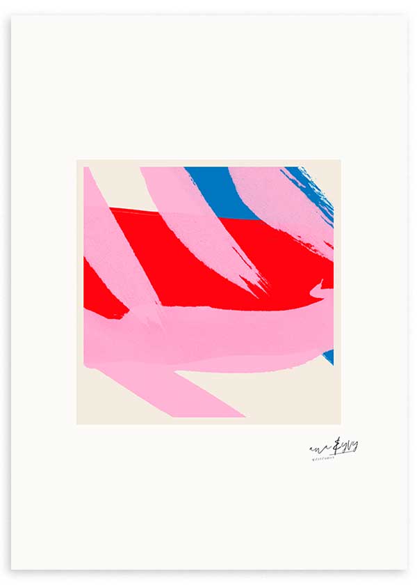 Cuadro de ilustración colorida en tonos rosas, rojos y azules. Un estilo abstracto y cargado de color que llena de estilo tu salón o dormitorio. Elige enmarcación y tamaño y cuélgalo en tus paredes directamente. Para ver más obras de este estilo entra en nuestra colección de cuadros coloridos o cuadros abstractos.
