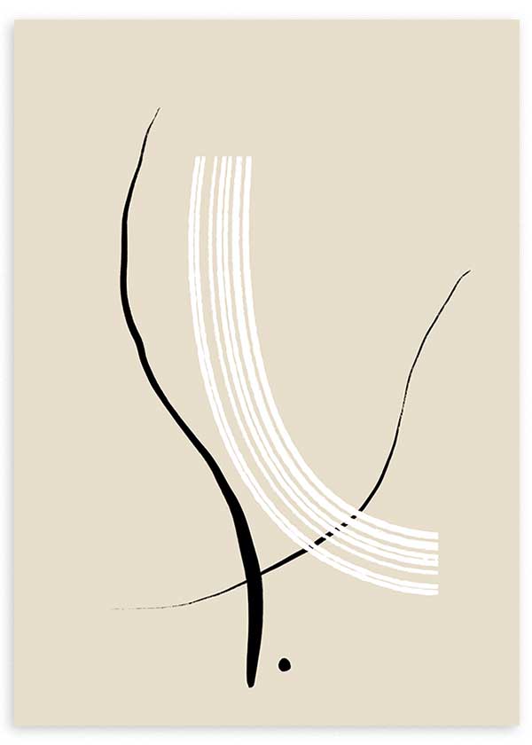 Cuadro minimalista y abstracto con ilustraciones de trazos blancos y negros sobre un fondo beige crema. Ideal para ambientes modernos, salones y salas de estar. Elige el tamaño y enmarcación que mejor te venga. Si te encanta este estilo, también puedes pasarte por nuestra colección de cuadros abstractos o cuadros minimalistas.