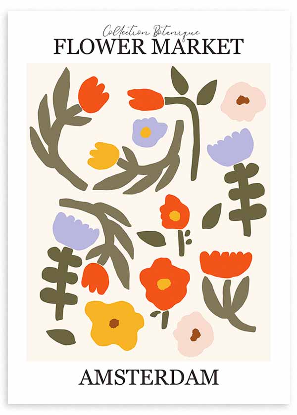 Cuadro con composición botánica de flores silvestres y hojas en formas simplificadas, acompañado por el texto Flower Market Amsterdam. Predominan los tonos coral, amarillo, lila, rosa empolvado y verde oliva sobre fondo claro, con un estilo floral de aire moderno y amable. Aporta frescura y un acento alegre, ideal para decorar una sala nórdica, un dormitorio luminoso o un rincón creativo.