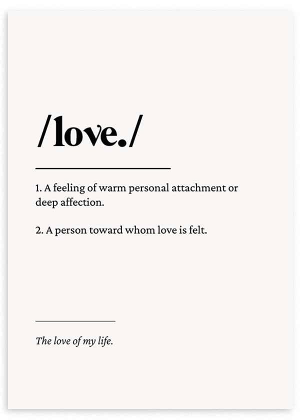 Cuadro con la palabra love en gran formato y una composición tipográfica tipo diccionario sobre fondo blanco, con texto negro y líneas finas que refuerzan su estética limpia. Su estilo con frases aporta un aire elegante y sereno, ideal para dormitorios, salones o rincones románticos donde se busca una decoración sobria, moderna y con significado emocional.