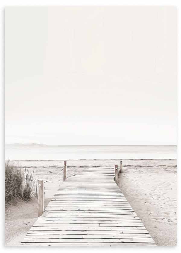 Cuadro nórdico de un camino de madera hacia una playa desierta. Colores predominantes beige y blanco, estilo fotográfico con tonos neutros. Transmite paz y serenidad. Puedes encontrar más obras de este estilo en cuadros nórdicos o cuadros fotográficos.