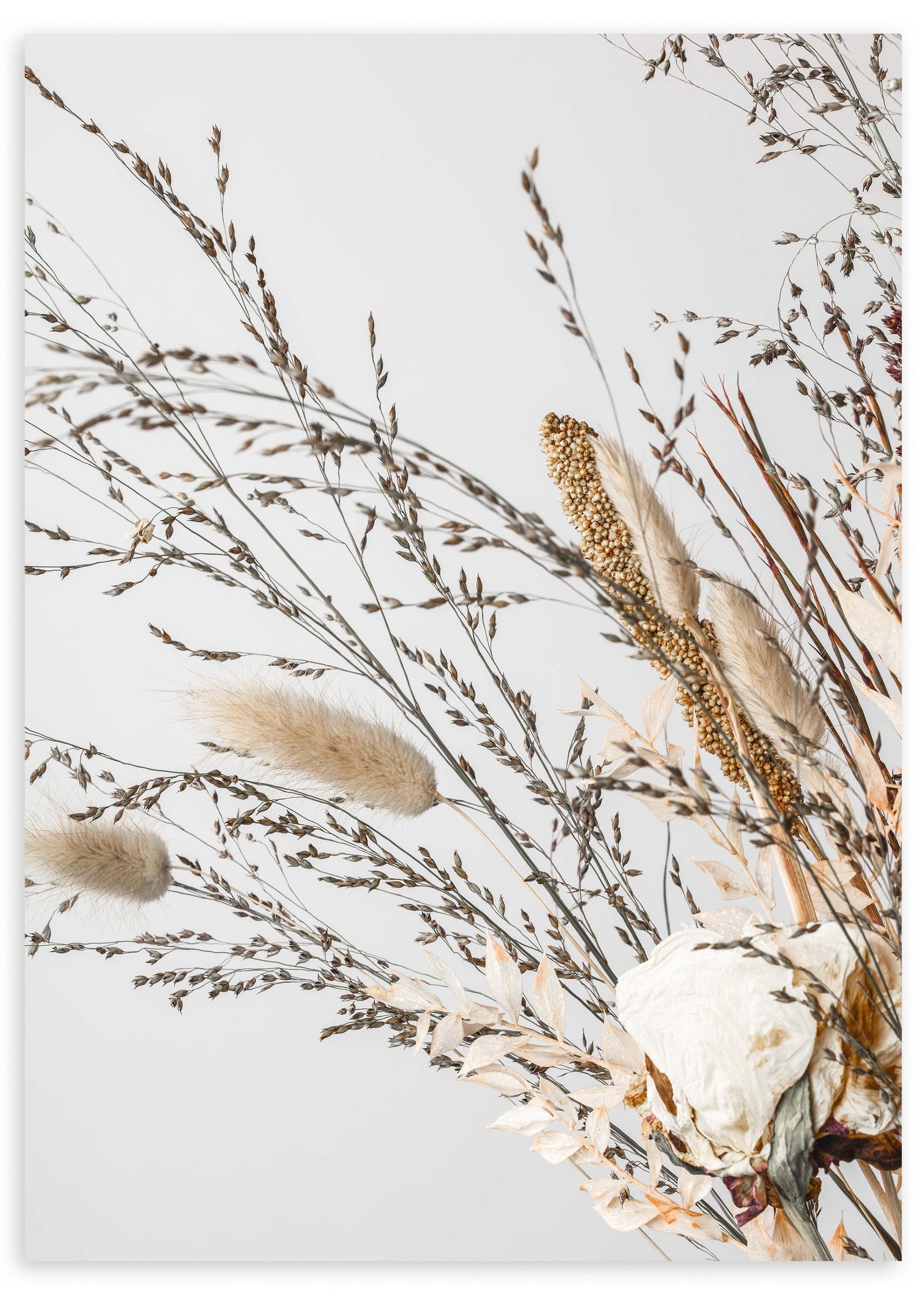 Cuadro con arreglo botánico de hojas secas marrones, cápsulas de amapola beige y jarrón blanco sobre fondo claro, de estilo minimalista. Disponible en kudeko.com