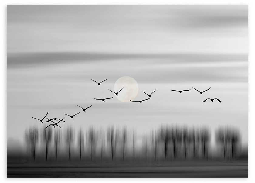Cuadro horizontal con una bandada de aves en vuelo sobre un paisaje de árboles difuminados, bajo una luna suave y un cielo en grises, negros y blanco roto. Su composición serena y etérea, de estilo naturaleza y paisajes, aporta profundidad visual y una atmósfera calmada. Encaja muy bien en salones contemporáneos, dormitorios relajantes o recibidores de estética sobria.