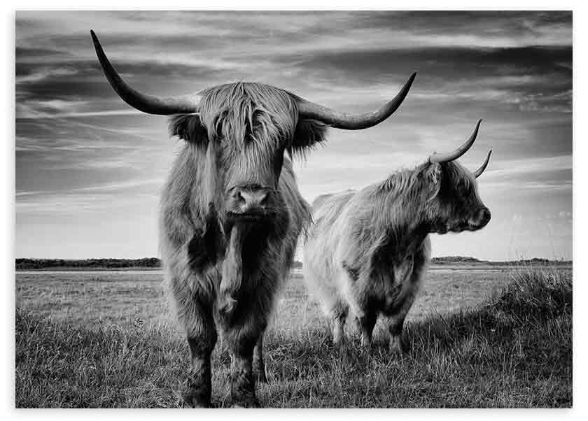 Cuadro horizontal con dos vacas Highland de largos cuernos en un paisaje abierto, captadas en una composición frontal en blanco y negro. El contraste entre el cielo nublado, la hierba y el pelaje aporta fuerza visual y un carácter sereno de estilo fotográfico. Ideal para salones modernos, despachos o comedores rústicos donde se busca una presencia elegante, natural y con personalidad.