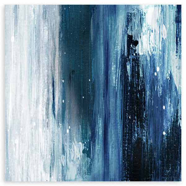 Cuadro cuadrado con composición abstracta de franjas difusas y texturas degradadas en azul índigo, blanco, celeste y negro. La mezcla de capas verticales suavizadas y contrastes profundos crea una pieza de estilo abstracto con presencia serena y contemporánea. Aporta sensación de calma visual y sofisticación, ideal para un salón moderno, un dormitorio elegante o una oficina con decoración actual.