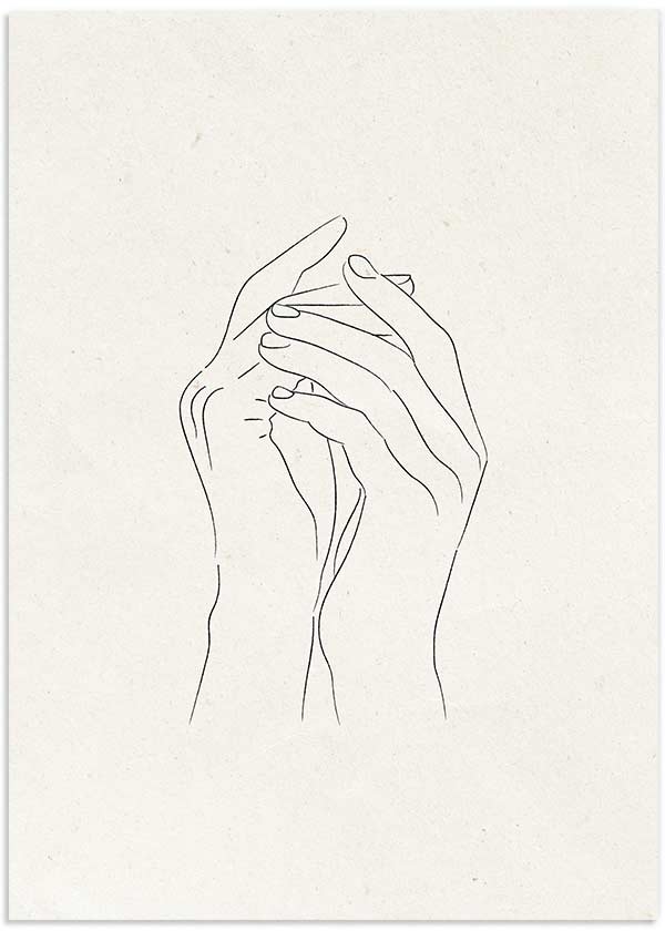 Cuadro con silueta de dos manos entrelazadas trazadas en negro sobre fondo beige claro, con una composición limpia y serena de estilo minimalista. La imagen transmite cercanía, calma y sensibilidad, ideal para aportar un acento íntimo y elegante en dormitorios, salones modernos o rincones de lectura con decoración neutra.