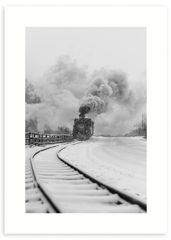 Cuadro de fotografía en blanco y negro de tren sobre paisaje nevado. Una obra fotográfica que puedes elegir hasta una tamaño de 100x150 cm con la enmarcación Minimal o Lienzo. ¡Decora con estilo! Mira obras del estilo decorativo de esta en nuestra categoría de cuadros fotográficos o cuadros en blanco y negro.