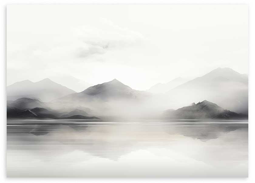 Cuadro horizontal con un paisaje de montañas difusas entre niebla, reflejadas sobre un lago sereno en tonos negro, gris y blanco. La composición transmite calma visual y profundidad, con un estilo naturaleza y paisajes de apariencia etérea y elegante. Encaja muy bien en salones contemporáneos, dormitorios relajantes o espacios nórdicos donde se busca una atmósfera suave y sofisticada.