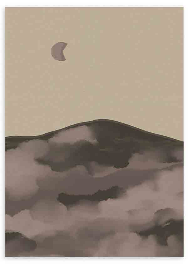 Cuadro con paisaje nocturno de colinas suaves y niebla difusa bajo una luna parcial, resuelto en tonos beige, gris topo y marrón oscuro. Su composición serena y depurada encaja en el estilo minimalista, aportando calma visual y profundidad sutil. Ideal para decorar un dormitorio contemporáneo, un salón de tonos neutros o un rincón de lectura con estética relajada.