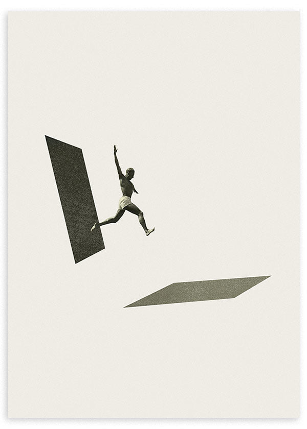 Cuadro de estilo vintage, collage de hombre saltando. Una obra con mucho estilo para lxs decoradorxs amantes de estas composiciones y formas artísticas. Si te ha enamorado, elige enmarcación y tamaño y... ¡a decorar! Encuentra más cuadros y láminas de este estilo en nuestra colección de cuadros vintage.