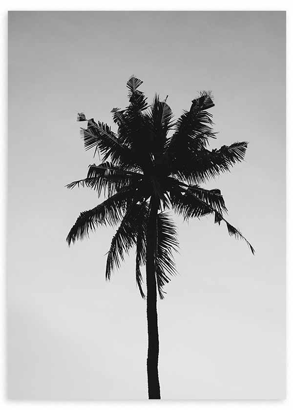 Cuadro con una palmera solitaria en silueta negra sobre fondo gris claro, de composición limpia y gran contraste visual. Su estética fotográfica transmite calma costera y un aire contemporáneo, ideal para aportar ligereza y personalidad a un salón moderno, un dormitorio sereno o una zona de descanso con inspiración mediterránea.