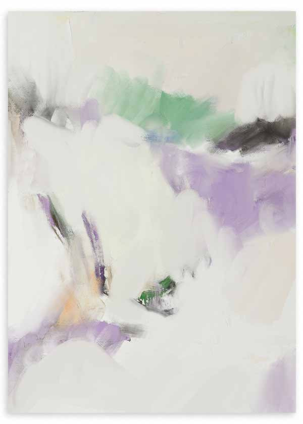 Cuadro abstracto de estilo etéreo con una paleta suave que combina blanco, lavanda, verde menta y toques oscuros difuminados. La composición sugiere formas naturales y vaporosas que transmiten calma y armonía, perfecto para aportar serenidad en salones claros, zonas de descanso o entradas minimalistas.