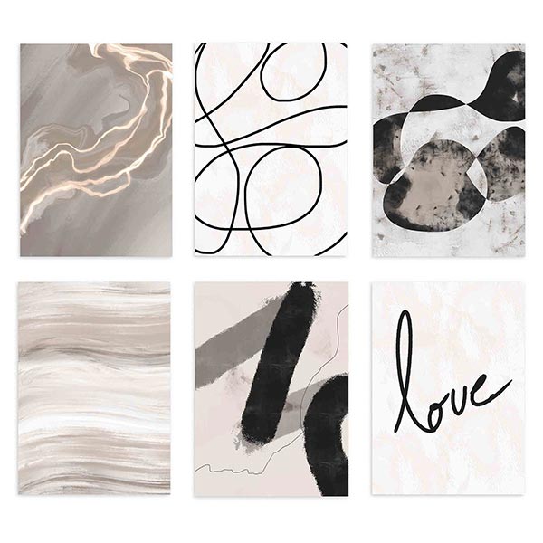 Conjunto de seis cuadros con composiciones abstractas en negro, beige, gris topo y blanco roto, donde aparecen líneas curvas, formas orgánicas, texturas suaves, trazos amplios y la palabra love en tipografía manuscrita. Su estilo abstracto aporta equilibrio visual y una estética serena, ideal para salones modernos, dormitorios neutros o espacios nórdicos con decoración elegante y contemporánea.