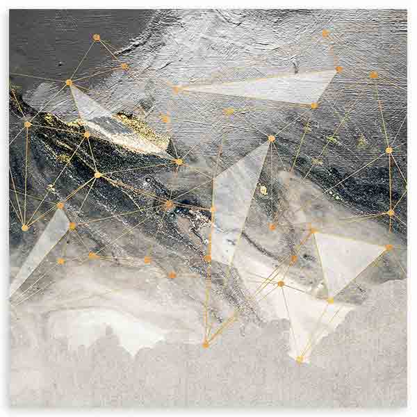 Cuadro cuadrado con composición abstracta de formas triangulares y una red de líneas doradas sobre un fondo en negro, gris, blanco y toques beige. La mezcla de texturas visuales y geometría sutil crea una pieza sofisticada de estilo abstracto, ideal para aportar profundidad y elegancia en un salón contemporáneo, un despacho moderno o una zona de recibidor con decoración refinada.