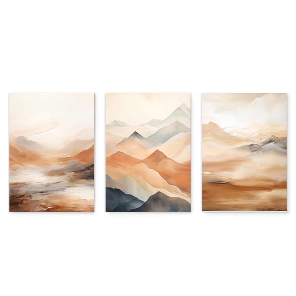 Conjunto de tres cuadros abstractos en tonos tierra, representación de paisaje montañoso. Una combinación de cuadros hechos para convivir el uno con el otro. Elige una enmarcación y tamaño para ambos cuadros. ¡A decorar! Los conjuntos son una muy buena opción para decorar cualquier pared, encuentra todos en nuestra colección de conjuntos de cuadros. Para llenar tus paredes de cuadros y láminas decorativas de este estilo puedes ver más en la categoría de cuadros abstractos.