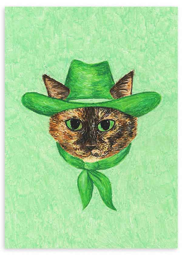 Cuadro ilustración de un gato carey con sombrero y pañuelo verde sobre un fondo verde claro. La imagen capta la expresión serena del gato con detalles realistas, mientras el sombrero y el pañuelo añaden un toque lúdico. Predominan los tonos verdes y marrones, con un estilo ilustrativo y naturalista. Este cuadro transmite una sensación de calidez y simpatía. Ideal para decorar habitaciones acogedoras o espacios de trabajo creativos, combina bien con decoraciones en madera y tonos neutros.