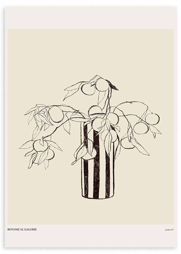 Cuadro con composición de ramas frutales en jarrón de rayas, trazada con líneas negras sobre fondo beige suave. Los frutos redondos y las hojas ligeras crean una escena serena de estilo ilustración, con una estética limpia y contemporánea. Su paleta neutra aporta calma visual y encaja muy bien en salones nórdicos, comedores luminosos o rincones de cocina con decoración natural y elegante.