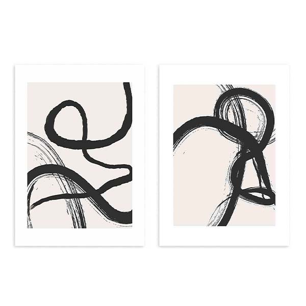 Conjunto de dos cuadros con composiciones abstractas de líneas negras gruesas y trazos curvos superpuestos sobre fondo beige claro. Las formas gestuales crean movimiento y contraste con una estética abstracto sobria y contemporánea. Su presencia decorativa aporta equilibrio visual y un aire moderno, ideal para salones minimalistas, recibidores elegantes o espacios de trabajo con tonos neutros.