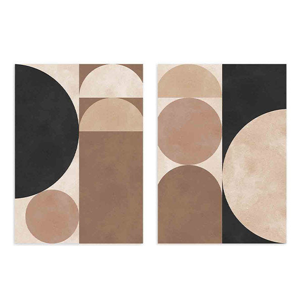 Conjunto de dos cuadros marrón minimalistas con diseño geométrico. Este set destaca por sus patrones circulares y líneas modernas en tonos neutros, ideales para añadir elegancia y equilibrio a espacios contemporáneos como salas, oficinas o dormitorios.