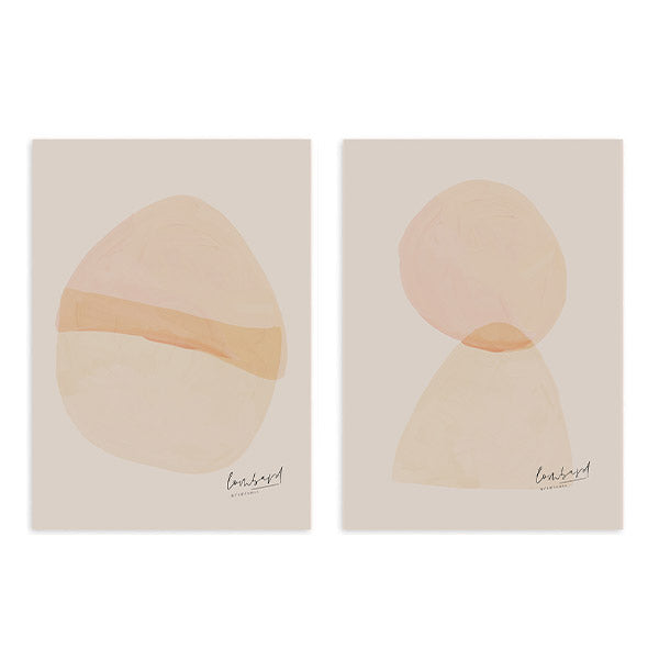 Conjunto de dos cuadros con formas orgánicas abstractas en tonos beige, crema y melocotón suave sobre fondo claro. La composición serena y equilibrada aporta una estética minimalista de líneas suaves y aspecto ligero. Encaja muy bien en salones contemporáneos, dormitorios luminosos o recibidores de estilo nórdico, donde suma calma visual y una sensación decorativa elegante sin recargar el ambiente.