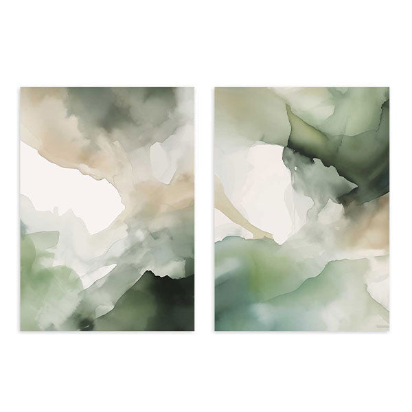 Conjunto de dos cuadros con composición abstracta de manchas fluidas y veladuras suaves en verde salvia, crema, beige y verde oscuro. Las formas orgánicas crean profundidad visual y una sensación serena, con un estilo abstracto elegante y actual. Ideal para decorar un salón contemporáneo, un dormitorio relajante o una oficina con estética natural y sofisticada.