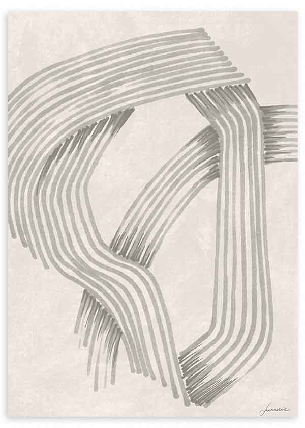 Quadro abstrato com formas curvas e interseções de linhas paralelas em cinza suave sobre fundo bege claro. A composição cria um jogo visual fluido e organizado, com uma estética serena e contemporânea. O seu estilo abstrato e a paleta neutra tornam-no adequado para decorar uma sala moderna, um quarto elegante ou um escritório com ambiente sóbrio e equilibrado.