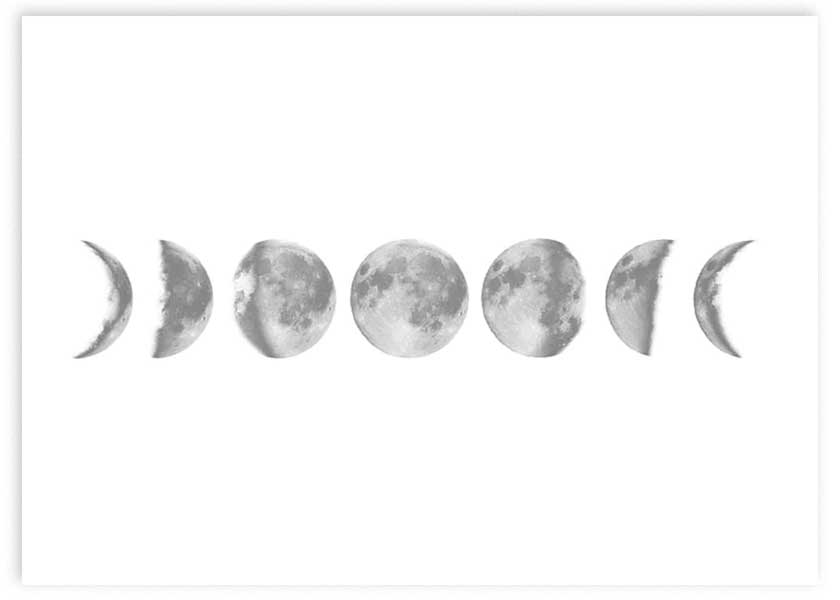 Quadro horizontal com uma sequência de fases lunares em cinzento suave sobre fundo branco, distribuída de forma simétrica e limpa. A sua estética minimalista transmite serenidade visual e um toque contemporâneo, ideal para quartos, salas modernas ou cantos de leitura onde se procura uma decoração de parede elegante, luminosa e com inspiração astronómica.