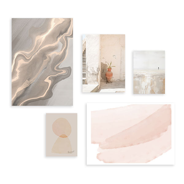 Conjunto de cinco pinturas em tons neutros e rosa com ilustrações abstratas, fotografias minimalistas e texturas fluidas. Uma combinação harmoniosa e serena, perfeita para trazer aconchego e elegância a qualquer espaço, como quartos, salas de estar ou estúdios.