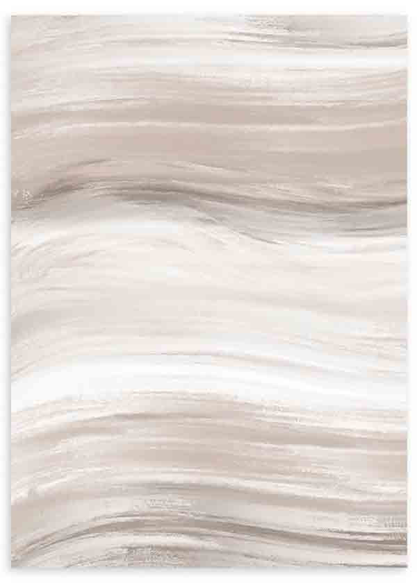 Quadro com composição abstrata de faixas onduladas em bege, areia, cinzento taupe e branco pérola, com um estilo sereno, equilibrado e contemporâneo. Disponível em kudeko.com