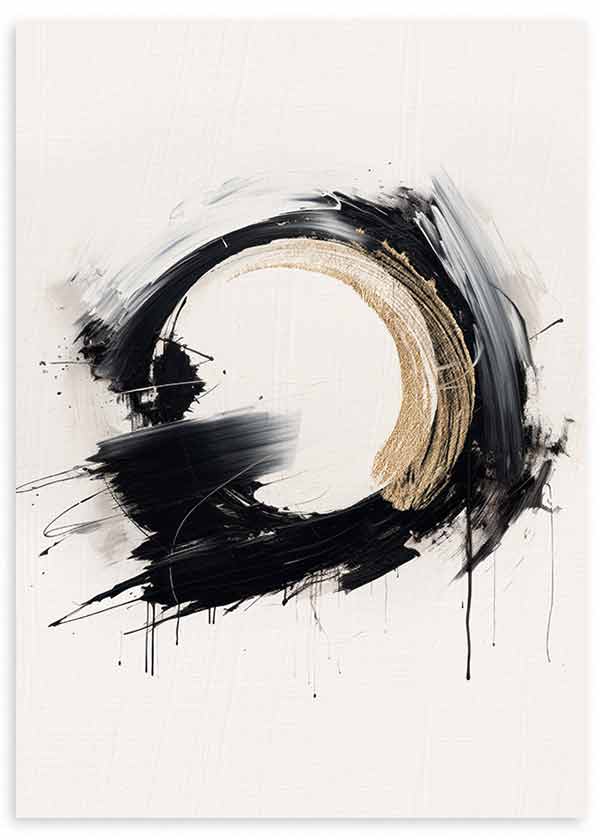 Quadro com composição abstrata centrada num grande gesto circular em preto e bege sobre fundo branco pérola, acompanhado por salpicos e traços largos que reforçam a presença visual. O seu estilo abstrato cria um ponto focal contemporâneo e equilibrado, ideal para uma sala moderna, um escritório cuidado ou espaços minimalistas onde se procura contraste e dinamismo.