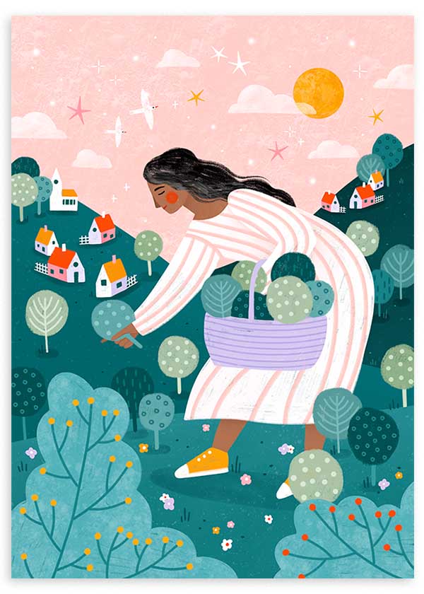 Cuadro ilustrado colorido de Bea Muller que muestra a una mujer en vestido a rayas recogiendo plantas en un paisaje de colinas verdes y casas con techos naranjas. Una escena encantadora y vibrante que transmite armonía, conexión con la naturaleza y alegría cotidiana, ideal para dar vida a cualquier espacio.